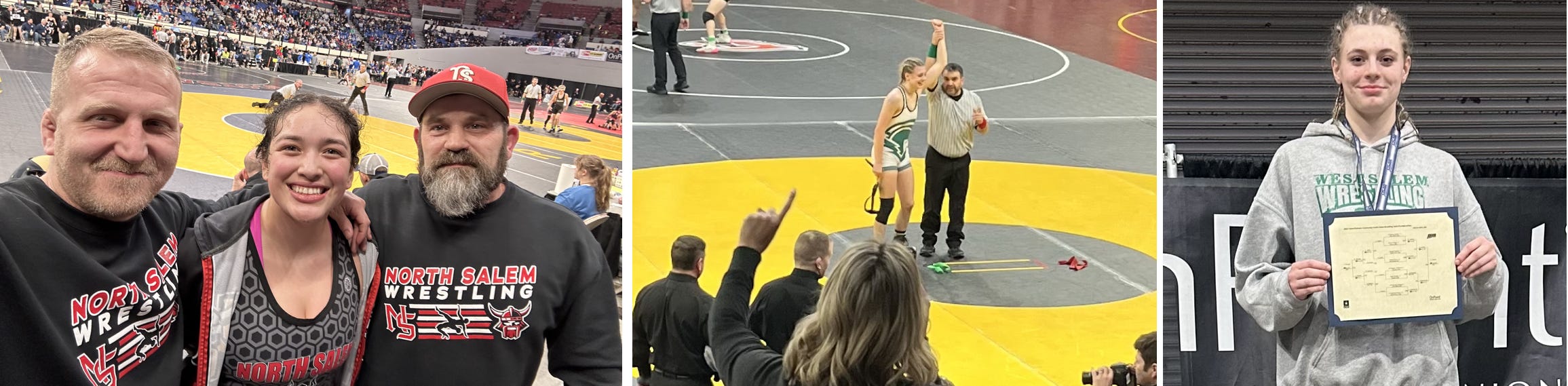 At 120 pounds, a big girls victory for North Salem junior Mariko Sonis. The overall number-three seed in her weight class, Mariko pinned her opening opponent, muscled out a 4-2 decision against second-seeded Layla Morris of Mountainside, then forged a 9-4 victory over top-seeded Sadie Hall of North Medford to claim the championship.