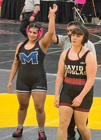 McNary’s last title bout competitor, Ali Martinez, was seeded second at 190 pounds of the 5A/6A girls bracket. The agile Martinez—who starred last spring for the Celtic softball team—pinned her way to the championship, putting David Douglas sophomore McKenzie Mills’ shoulders to the mat 1:59 into the championship match.